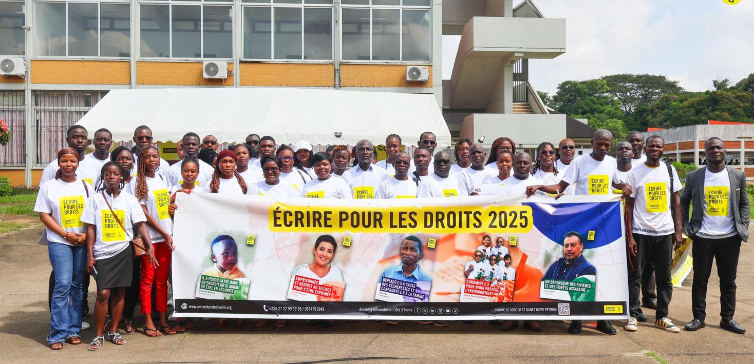 La campagne mondiale Écrire pour les droits 2025 a été officiellement lancée le mardi 25 novembre 2025 à l’Université Félix Houphouët-Boigny de Cocody, au sein de la Faculté de Droit, espace Fontaine. Cette mobilisation s’inscrit dans le cadre de l’initiative annuelle portée par Amnesty International, qui encourage chaque année des millions de personnes à écrire des lettres en faveur de personnes confrontées à des violations graves de leurs droits fondamentaux.